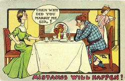 Late in 1907 or early in 1908 a number of "F S" sets (Take a Friend's Advice, Mistakes will occur, Who said lair? and Advice to ...) appeared in Britain published either as "The Popular Series" or with no series or publisher names. At about the same time the same sets were printed by the short-lived firm A. Q. Southwick of New York - including some modifications for the American market. Southwick also published three sets (Leap Year, Saucy Little Bird and Affinity) which are unsigned and which appear to have been produced specifically for the American market, but while it is possible it is more likely that the artist was not "F S". Two further U.S. sets (Dear Hubby and Dear Wifey) are very much in the "F S" style - so are almost certainly by him.