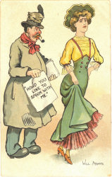 Joseph Asher started selling postcards in about 1906, from an address in Cheapside, London. He later moved to Paternoster Row and then Ivy Lane from which most of his cards - with a distinctive "J A" logo were published - many by Donald McGill. Some of the earliest comic cards were in the "Selwell Series" labelled "J W A & Co," including a number by Will Adams. The company ceased to operate when Joseph Asher (who was German) was interred at the outbreak of the First World War. So far 4 "F S" cards have been located, numbered 1551, 1552, 1553 and 1554, all with Early Saxony backs. They come from at least three different sets. This raises the possibility of a trial set of six individually selected cards was prepared for Asher made up of cards form sets currently being printed. Some years later Asher was selling cards signed Fred Spurgin in the Coon Series. However Asher clearly used a wide range of artists, and especially Donald McGill and there is mo reason to think Spurgin was every heavily involveed in producing cards for the company. |