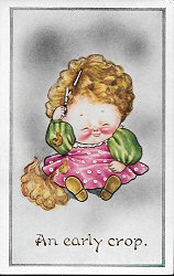 In the cards produced by "Fred Stone" and "F S" up to 1907 there were no post cards of individual children. After 1910 Fred Spurgin regularly produced quality cards showing children. There appears to be a series of unsigned card sets - including the Kute Kiddies series published by Inter Art andthe Infantastic Series by Watkins & Kracke and the Humorous Art Series (below). Then came signed sets in the Paternoster Series (Avenue Publishing) and then various children series published by Inter-Art. This has been considered in detail on the page Round faced children cards which argues that the following cards are by Fred Spurgin. |
