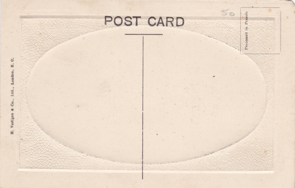 In 1904 Mr Howe linked up with Herbert Taylor Vertigen (who had worked with Henry Moss & Co) to produce post cards by Howe, Vertigen & Co. Mr Howe left in 1906 and a wide variety of cards were produced by H Vertigen & Co, of 12 Carthusian Street, Aldergate Street, London, the majority being printed in Saxony and sometimes labelled "H. V. & Co." From November 1909 the company traded as "H. V. & Co. Ltd." but seems to have stopped trading shortly afterwards.