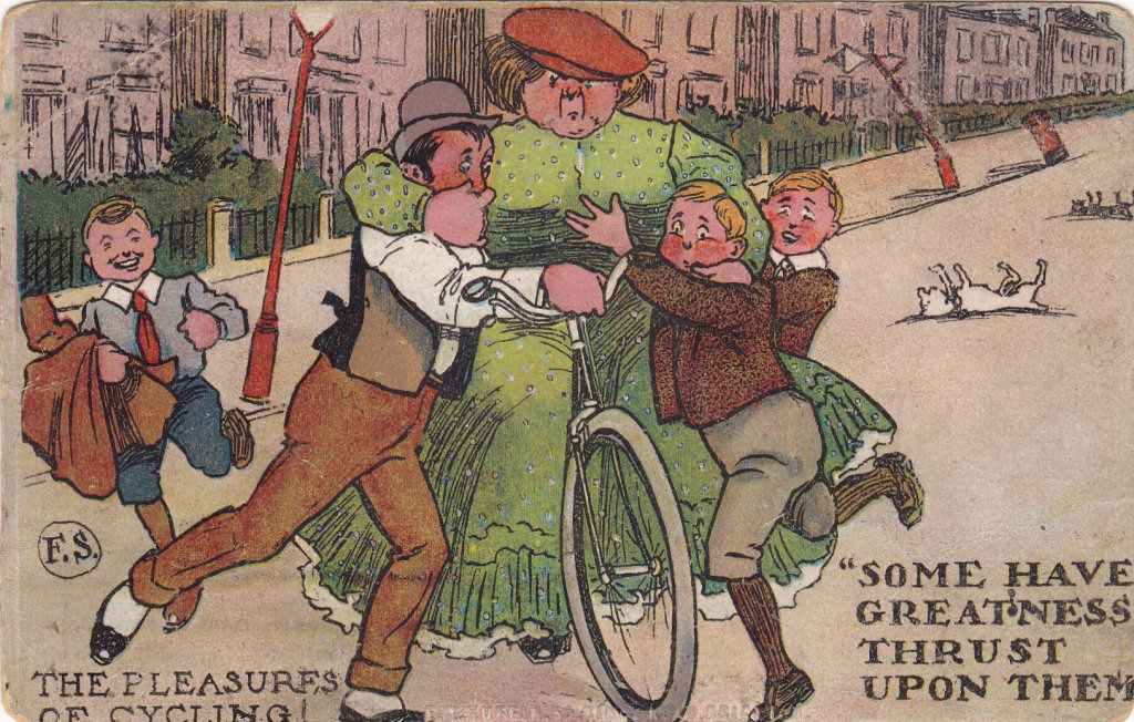 The Pleasures of Cycling Some have greatness thrust upon them Signed "F S"