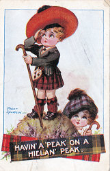 CONCLUSIONS What is clear is that between the closure of the London View Co Ltd in 1907 and 1911 Fred Spurgin had acquired the ability to produce attractive comic cards, using children, and I have identified four different sets which could represent stages in the process. All four companies were within the post card publishing area of Central London which Fred undoubtedly knew well, and in each case there is a possible reason to believe that Fred Spurgin had other contacts with the company. The Kute Kiddies case is more straight-forward. In 1911 Fred Spurgin started producing a large number of signed sets for the International Art Company, including a number featuring children, and may well have produced earlier unsigned cards. The pair of cards shown here, with the signed card being a redrawn version of the unsigned card, seem to show a definite connection - making it reasonable to assume that these cards were by Fred Spurgin. The Infantastic series is often considered to be by Fred Spurgin, and there were strong links between the Watkins family and the London View Co Ltd. Bernard Watkins was one of the first to "publish" the early "F S" cards and Watkins & Krake also produce the Dauber series (by Spurgin). The style is also compatible with later Fred Spurgin children comic cards and there can be no doubt that he was the artist behind this series. Watkins & Krake were another short-lived company so it would not have been unreasonable to Fred to have looked for other openings and the Humorous Art Studies Series could well have been the result. Shamrock & Co was publishing some very different Fred Spurgin signed cards. While there may be some small style differences, when an artist is producing similar cards for two different companies he is likely to deliberately introduce such differences. My opinion is that his series should also be considered to be by Fred Spurgin. To conclude, the cards shown above illustrate a clear stepwise pathway by which Fred Spurgin developed the ideas of Grace Gebbie Weiderseim over a period of years. |
