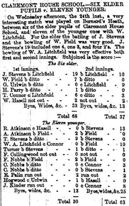 The Herts Advertiser of 27th June 1868 reported a cricket match played on Bernards Heath between six elder pupils (J. Stevens, W. Field, G. Urlwin, H. Parry, T. Connor, and W. Hasell) of Claremont House School and eleven younger pupils (R. Atkinson, A. Atkinson, T. Stevens, W. A. Litchfield, Turner, F. Collingwood, F. Nobbs, C. Nobbs, C. Nobbs, E. Palin, Hogwood, and J. Kinder.):