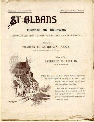 The following extracts are from a very long review from The Antiquary Volume 29, Jan-Jun 1894 [full review available online] St. Albans : Historical and Picturesque, with an Account of the Roman City of Verulam. By Charles H. Ashdown. Illustrated by Frederic G. Kitton. Elliot Stock. 4to., pp. xii, 308, seventeen plates, and ninety-four text illustrations. Price £2 2s. ST. ALBANS is an English town so brimful of interest and so justly entitled to distinction, that it is not a little remarkable that no monograph the least bit worthy of the place has hitherto been attempted. To Messrs. Ashdown and Kitton belongs the distinction of not only making the attempt, but of achieving a considerable measure of success. They do not, however, lay claim to any exhaustive search of records, and several of our towns have fallen into the hands of more erudite topographers ; but they are to be much congratulated on these pleasantly written, and in the main accurately compiled, pages, and more especially on the many charming drawings, which, alas ! but too often represent bits that have quite recently disappeared or have been improved and restored till they have lost all trace of true beauty or value. [the review end] This beautiful work, which does much credit to all engaged in its production, is limited to three hundred copies. We should think it probable that all or nearly all will have been taken up before this notice appears.