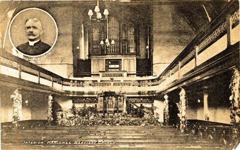 Interior Marlowes Baptist Church Rev W Wright Robinson, Pastor Published by H. W. Flatt, Boxmoor The Baptist church at Marlowes, erected in 1861 on the site of one founded in 1679, will seat 800 persons. [Kelly's 1908] |