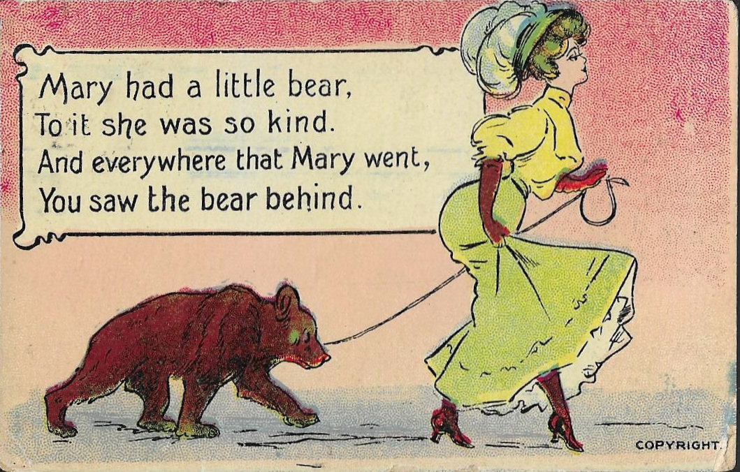 Mary had a little bear To it she was so kind, And everywhere that Mary went You saw the bear behind CPC Co M 12 July 1908 |