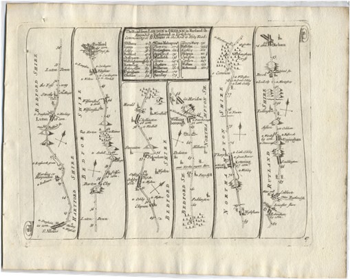 It was a small step from listing the places along the route to reproducing it as a route map, The above example was published by John Ogilby and printed in a portable form by John Senex, at the Globe, Salisbury-Court, Fleet Street, London, in 1719 |