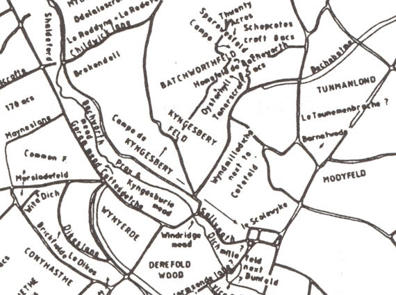 KINGS LANGLEY. Long Tags (cf. Tagges, Taggescroft 1437 Ct, Tagges land 1556 AOMB. Cf. Stagsend supra 36). From the TA we have Briery Fd (cf. Brierie croft ib.); Broad Fd (le Brodefeld 1382 Ct); Brook Fd (Brokefeld 1556 AOMB); Dell Fd (cf. le Dell ib.); Dellage Fd (Delledge ib., i.e. 'dell edge'); Heath Fields (cf. Richard atte Hethe 1437 Ct); High Fd (Highfeld 1556 AOMB); Kitchen Croft (Kitchin croft 1623 ib.); Lamb Croft (Lambe croft 155 I SidSus); Little Fd (cf. Litle croft 1556 AOMB); Long Fd (Longefeldes ib.); Nookerty is full of corners; Pear Tree Turrett (cf. Peartre croft ib.); Pedcroft (Petcroft 15th VCH ii, 235); Reddings (cf. le Ryding 1437 Ct, v. hryding); Round Fd (cf. Rounde crofte 1556 AOMB); Spring Fd (cf. le Sprynge 1413 Ct and spring supra 259); Winch Fd (cf. Winchcroft 15th VCH ii, 235, v. supra 24); Wood Fd (cf. Woodcrofte 1556 AOMB). The book Reconstruction and Measurement of Landscape Change includes a detailed study of the filed names for the parishes of St Albans (Abbey, St Michaels, St Peters and St Srephens) and the parishes of Redbourn and Sandridge. It contains very long lists of field names together with their sources but the precise locations of the fields is not given in most cases - although the following is part of the reconstructed map of medieval field names immediately round St Albans.