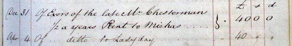 | 1852 | William Brown makes arrangements to let the house for the Rev James Williams. James Chesterman took it at the end of May or early June, purchasing the furniture, and died on 1st July. Mrs Chesterman approaches William Brown to let the house and sell the furniture. However the rent continues to be paid until 1856 by James Chesterman's executors. |