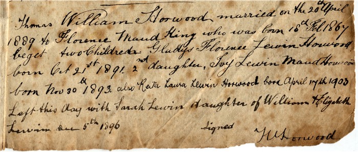 Thomas William Horwood married on the 20th April 1889 to Florence Maud King who was born 18th Feb 1867 beget two children Gladys Florence Lewin Horwood born Oct 21st 1891. 2nd daughter Ivy Lewin Maud Horwood born Nov 30th 1893